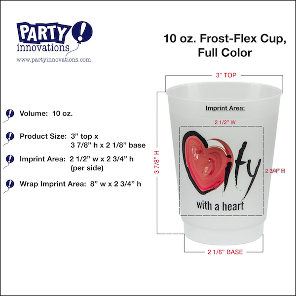 Cup Dimensions: 3" top x 3 7/8" h x 2 1/8" base Imprint Area: 2 1/2" w x 2 3/4" h (each side) Wrap Area: 8" w x 2 3/4" h - There will be a gap of approximately 1/2 - 3/4". If you need your art to wrap around the entire cup without a gap, please contact us for other options. Please note: Frost-Flex™ cups sometimes have scratch or rub marks from the molding process. Horizontal lines may be visible in print, due to the digital printing process (see example in product images). These are not considered a defect. Variation of plastic "shade color" is not considered a defect. |